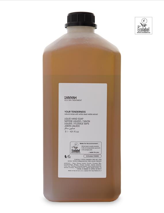 SMOOTHING LIQUID SOAP, 3 L, ECOLABEL CERTIFIED, ANYAH Liquid Soap enriched with white nettle extract, for a gentle daily cleaning of skin and hands. The formula has a high compatibility with the skin thanks to the high quality of the ingredients with proven environmental sustainability.